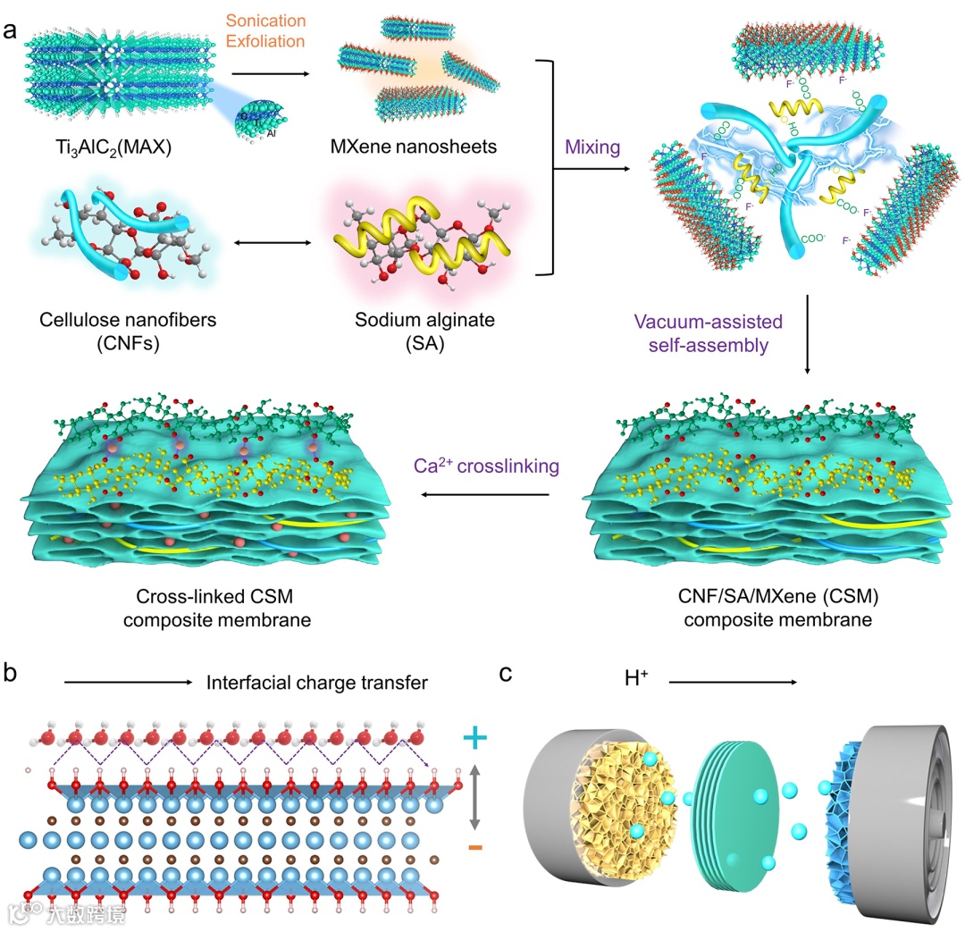 为解决质子交换膜的现存问题,天津科技大学司传领团队探索了一种基于钙离子交联的纳米纤维素/海藻酸钠(CNF/SA)复合网络锚定二维MXene纳米片的新型质子交换膜的设计策略。在CNF/SA复合基质中,钙离子可以与两者的羧基配位将非均相的聚合物链从非晶态状态转变为交联互锁状态,而具有丰富氢键网络的MXene纳米片被牢固地锁定在聚合物网络中。因此,所获得的CNF/SA/MXene复合膜表现出优异的机械强度和稳定性。