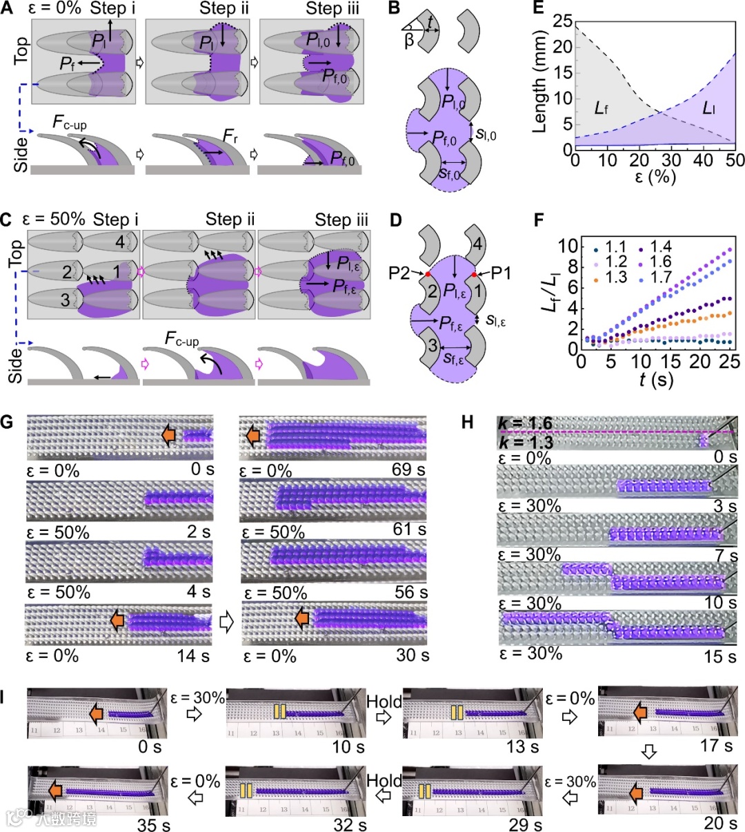 调控液体铺展前沿正交方向作用力的竞争,可实现液体运输方向转换。在TELD的液体操控模式1中(图2),当TELD(k = 1.6)处于未拉伸状态时,液体铺展在侧向所受的阻力大于向前的阻力,液体沿正向(Df)运输;向TELD施加应力至TELD的临界应变27%以上时,棘轮间距重构导致液体在侧向(Dl)所受阻力减小,向前阻力增加,液体运输方向发生转变;通过拉伸-释放TELD,可以实时操控液体流动路径。更具突破性的是,作者提出“应力阀”概念—拉伸TELD伸长率至30%可瞬间阻断液流,使液体暂停运输2分钟以上,释放应力后液体流动立即恢复,无需物理阀门。通过结构参数梯度k值设计,液体可在梯度TELD中实现90°侧向转向后继续向前运输。