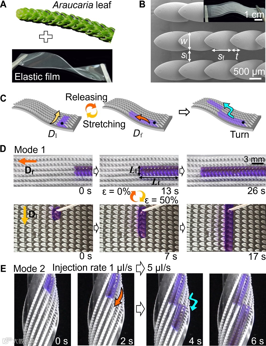 受南洋杉叶片启发,结合聚二甲基硅氧烷(PDMS)和棘轮阵列结构设计了弹性液体二极管(图1)。利用3D打印技术制备仿南洋杉叶片棘轮阵列硬模板,结合软印刷技术与基底预拉伸制备了TELD。调控TELD基底层的应变(模式1)或液体注射速度(模式2)实现了液体流动方向的可逆操纵,为微流控系统提供了一种动态控制新策略。