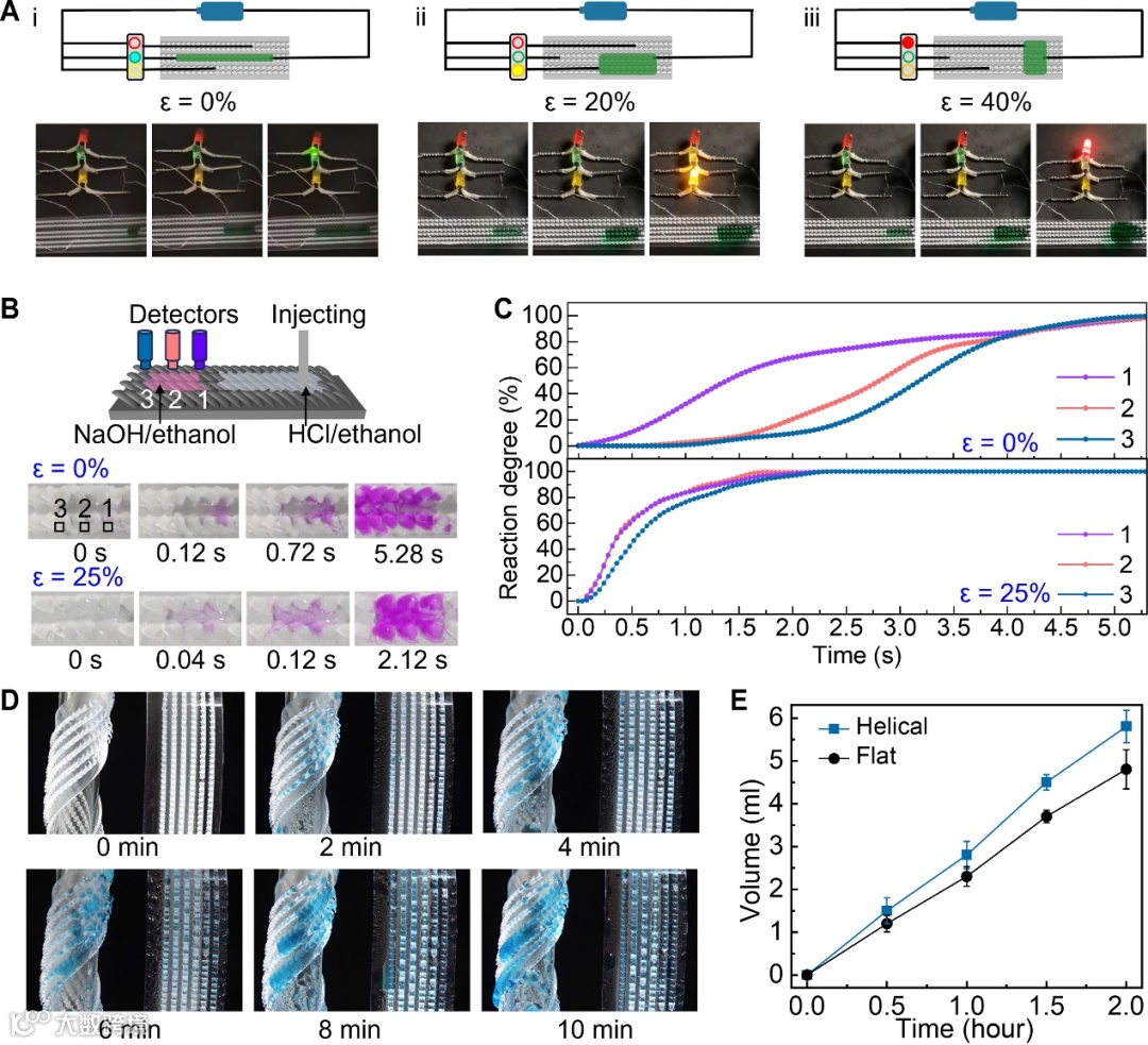 TELD可以用于可编程流体逻辑器件。通过将导电溶液集成至开路TELD,成功实现了应力-光信号转换:未拉伸时,液流沿预设两列通道导通绿色LED;施加20%应变使运输路径扩展至四列,触发黄色LED;40%应变下运输路径跨越六列,点亮红色LED(图4A)。这种无芯片流体逻辑系统可直接将机械应力转化为可视化信号。