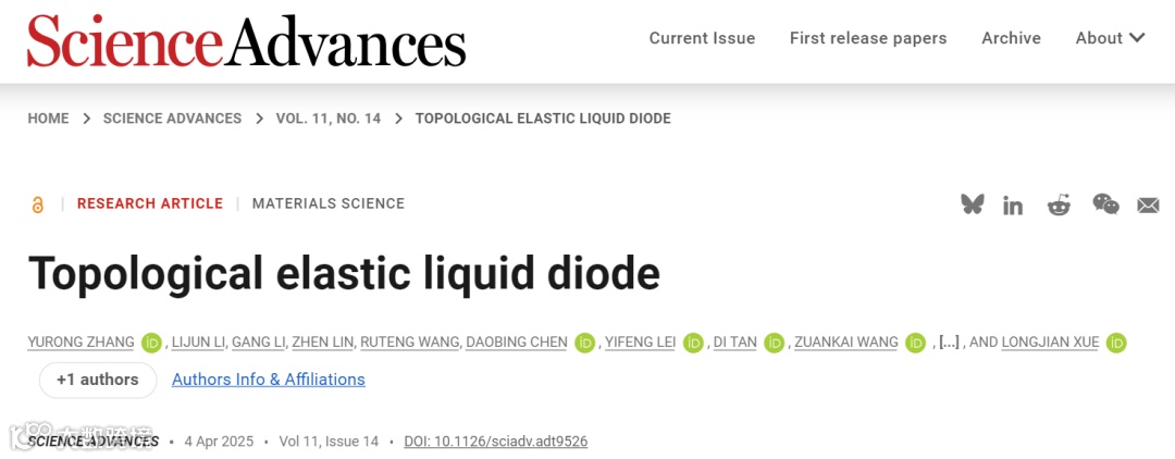 该研究以“Topological elastic liquid diode”为题发表在《Science Advances》上。武汉大学薛龙建教授、赵焱教授和香港理工大学王钻开教授为论文共同通讯作者,武汉大学工业科学研究院博士生张钰荣为论文第一作者。