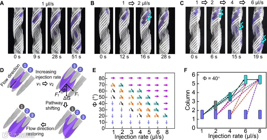 该团队进一步提出第二种操控模式(模式2),通过动态调节液体注射速率,在螺旋形TELD上实现流动路径“瞬时变轨”。如图3所示,当乙醇以恒定速率(如1 μL/s)注入时,液流沿初始两列棘轮稳定向前运输。一旦注入速率突增(如从1 μL/s提升至2 μL/s),液流轨迹立即横向跳转至相邻两列棘轮,并保持Df方向继续流动。通过阶梯式提升流速(1→2→4→6 μL/s),液流路径可连续三次横向偏移,形成精准的“轨道切换”效应。模式2的核心在于流速突变引发动态力竞争:流速突增时,液体无法及时输送至前方棘轮,导致前缘液体堆积,堆积液体的重力分量沿螺旋方向分解为侧向驱动力Fl = ∆GsinФ与正向驱动力Ff= ∆GcosФ。当Fₗ克服侧向阻力(Rp,l)时,液面横向扩展接触相邻列棘轮,触发路径切换。模式2首次将流体惯性效应与结构几何参数(Φ)耦合,实现了非接触式、低能耗的流动路径重构。相比传统微阀控制,该方法无需复杂驱动元件,具有快速响应性,为高集成度微流控芯片设计开辟了新维度。