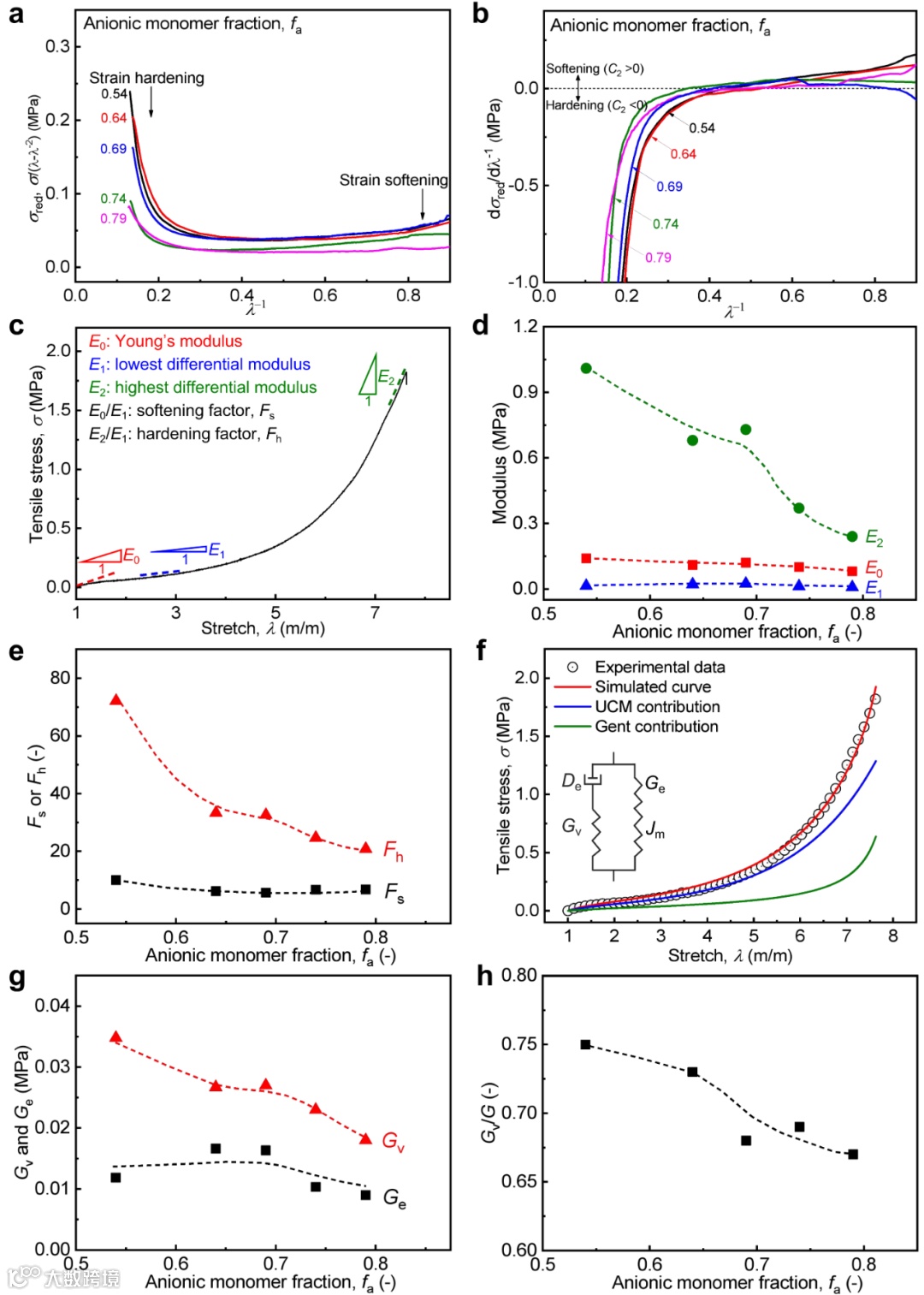 图4 具有不同阴离子单体占比(fa)的n-PA-Fe杂化水凝胶的应变软化和硬化行为及其粘弹性贡献。(a,b)基于Mooney-Rivlin模型的σred~λ-1曲线;(c,d)基于样品拉伸应力拉伸曲线所定义的三种模量(E0、E1和E2)及其随fa 的变化;(e) 水凝胶表观软化(FS)和硬化(FH)因子随fa 的变化;(f)粘弹性理论模型对拉伸曲线的模拟曲线;(g,h)拟合得到的样品中黏弹性(Gv)和弹性(Ge)部分随fa 的变化。(此处fa=0.54)