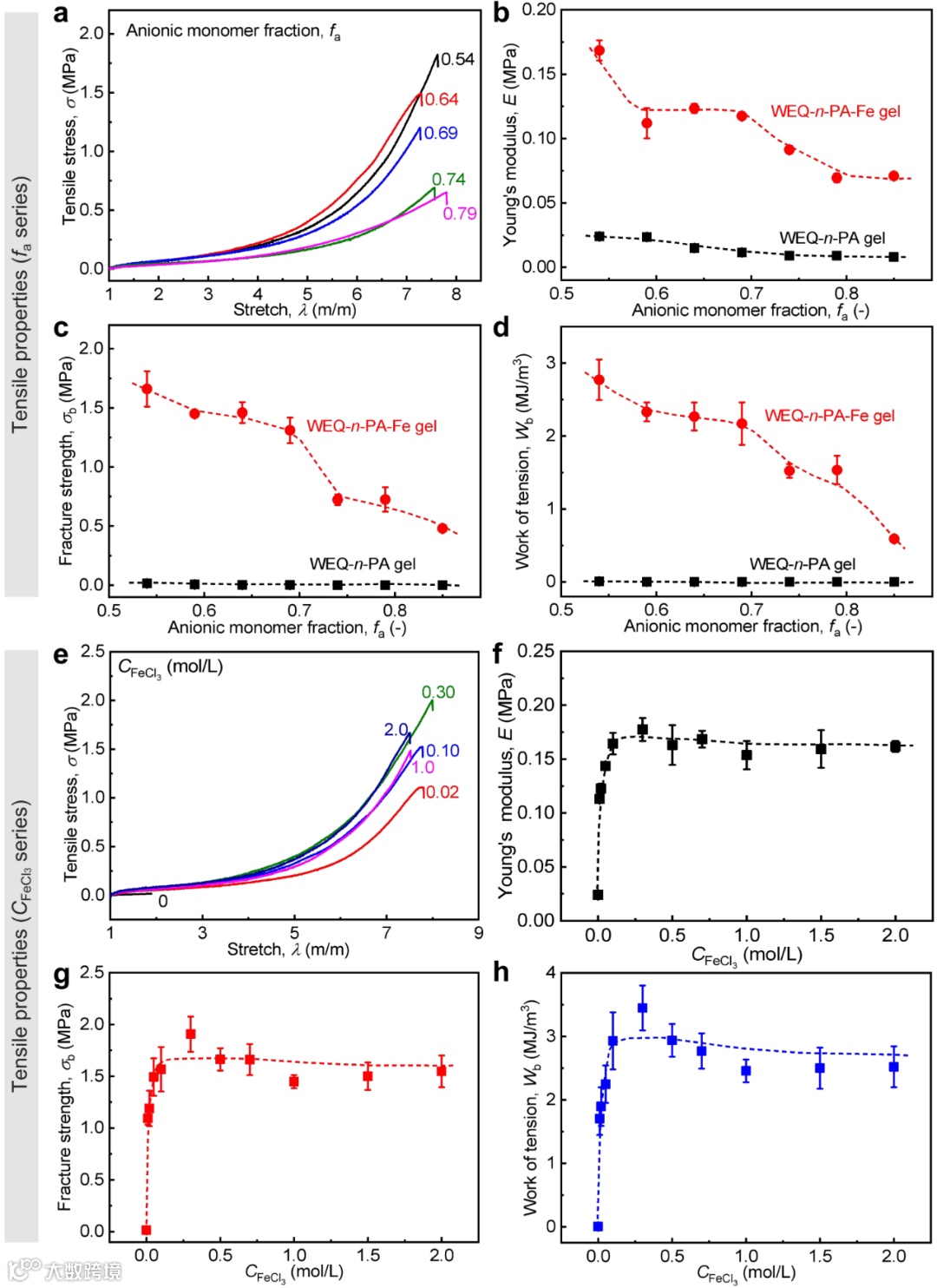 图2 具有不同阴离子单体占比(fa)和FeCl3浓度(CFeCl3)的n-PA-Fe杂化水凝胶的拉伸行为:(a-d)不同fa对杂化水凝胶拉伸性能的影响(此处CFeCl3=0.7 mol/L);(e-h)不同CFeCl3对杂化水凝胶拉伸性能的影响。(此处fa=0.54)