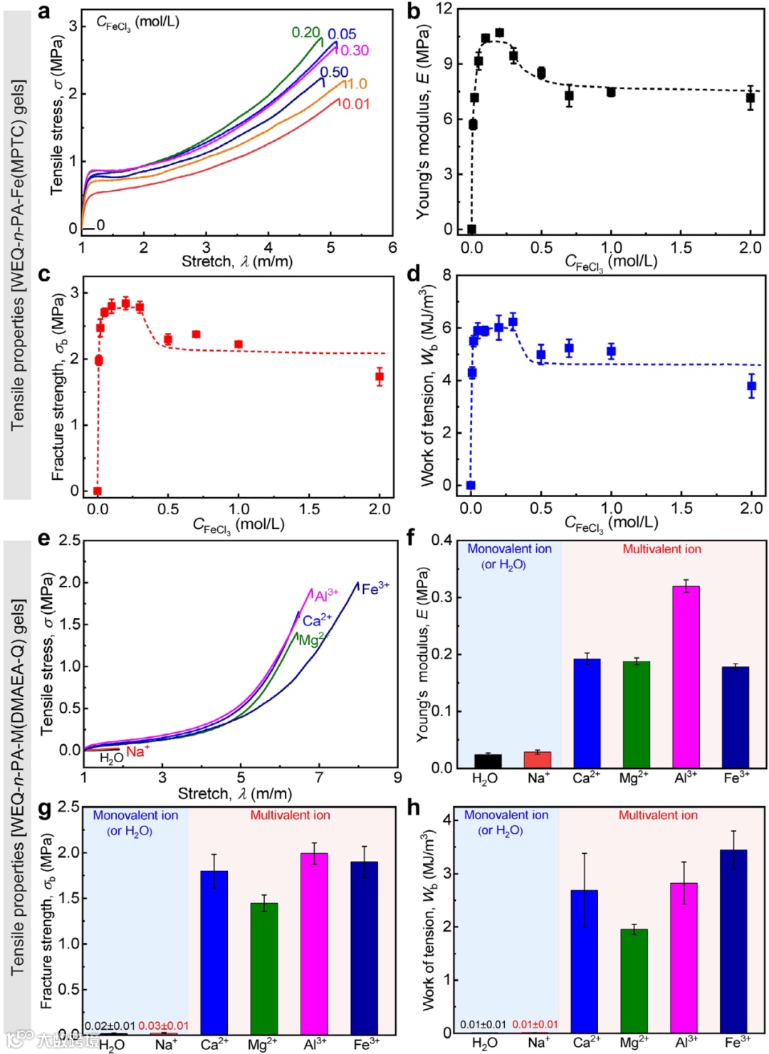 图3 所提出协同实现n-PA-Fe杂化水凝胶强韧化方法的普适性:(a-d)更换另一种n-PA水凝胶体系所得到的杂化水凝胶的拉伸性能数据(此处fa=0.66);(a-d)选用不同多价金属离子透析溶液所得到的杂化水凝胶的拉伸性能数据。(此处CFeCl3=0.3 mol/L,fa=0.54)