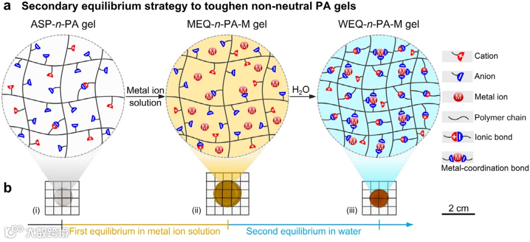图1 强韧非中性两性聚电解质(n-PA)水凝胶的设计及制备:(a) 基于“二次平衡法”的强韧n-PA杂化水凝胶的设计和制备;(b)不同状态所对应的水凝胶实物照片。