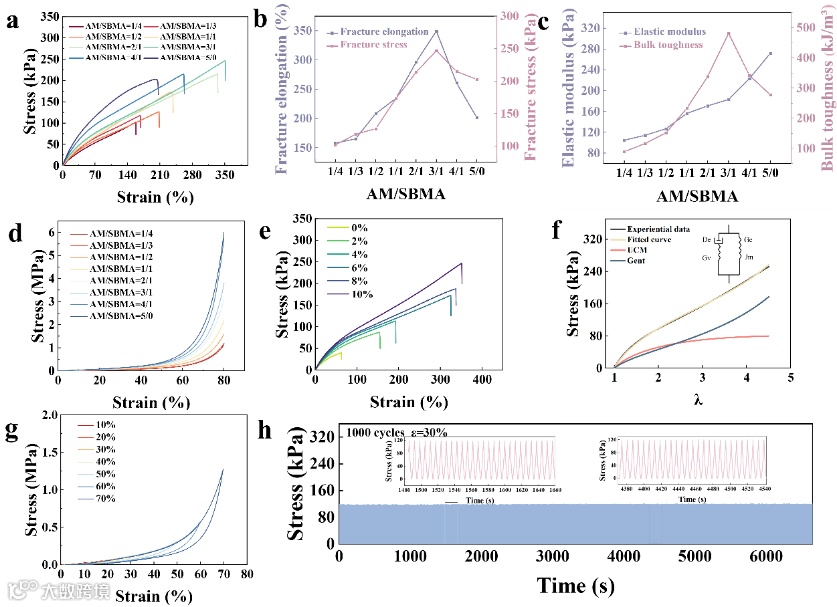 图2。凝胶的机械性能。(a)拉伸应力-应变曲线;(b)断裂应力和断裂伸长率;(c)不同单体配比凝胶的弹性模量和体韧性;(d)不同单体比下凝胶的压应力-应变曲线;(e)不同明胶含量凝胶的拉伸应力-应变曲线;(f)Maxwell (UCM)和Gent应变硬化模型拟合的PASG/NaCl/Gly凝胶的拉伸应力-应变曲线;(g)PASG/NaCl/Gly凝胶的渐进压缩曲线;(h)30%应变下PASG/NaCl/Gly凝胶1000次的循环压缩曲线。