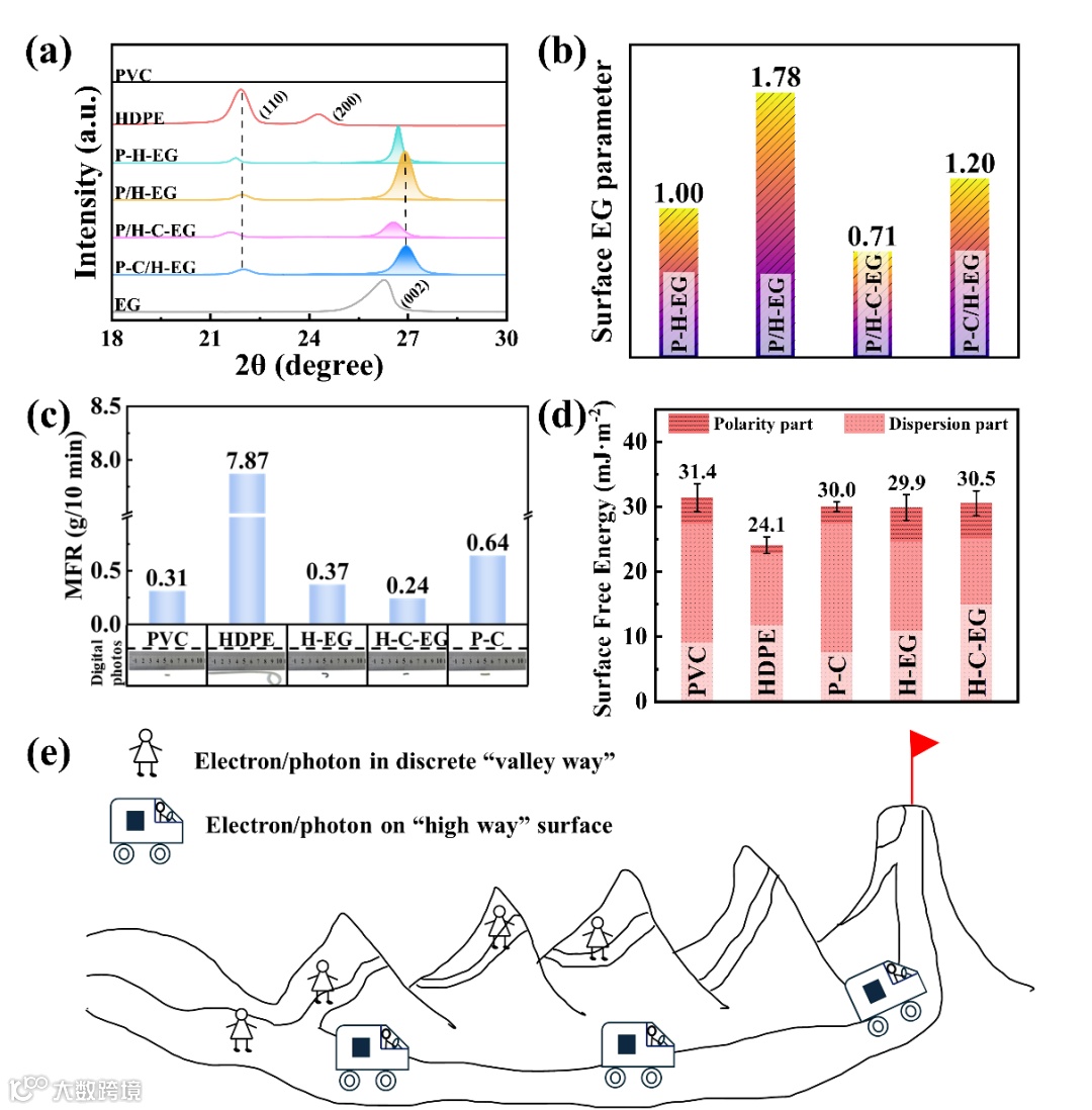 图2功能表面的形成机制(a)XRD曲线;(b)表面EG参数;(c)MFR;(d)表面自由能;(e)导电机制及其提高效率的示意图。