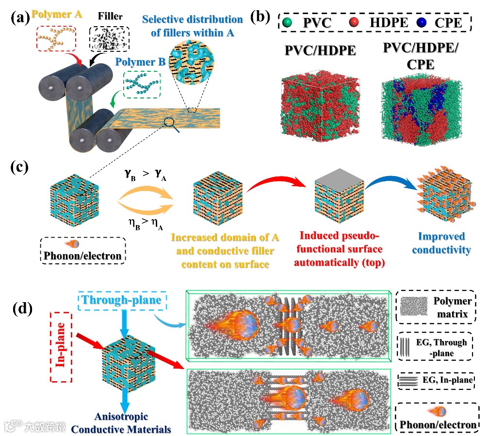 图3(a)双连续相结构复合材料的制备示意图;(b)聚合物体系的DPD模拟结果;(c)伪表面自主形成的原理图;(d)基于EG制备各向异性导电材料的示意图。