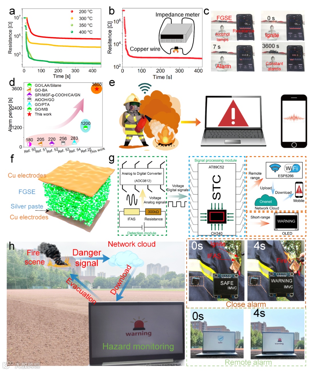 高温环境下FGSE海绵的电阻迅速下降并稳定,表现出明显的热响应特性。此外,在酒精灯加热下,电阻在7.1s内从绝缘状态下降到104Ω。基于此,设计了一种可穿戴式火灾报警装置,实现了无空间距离限制的远程传感信号传输功能。