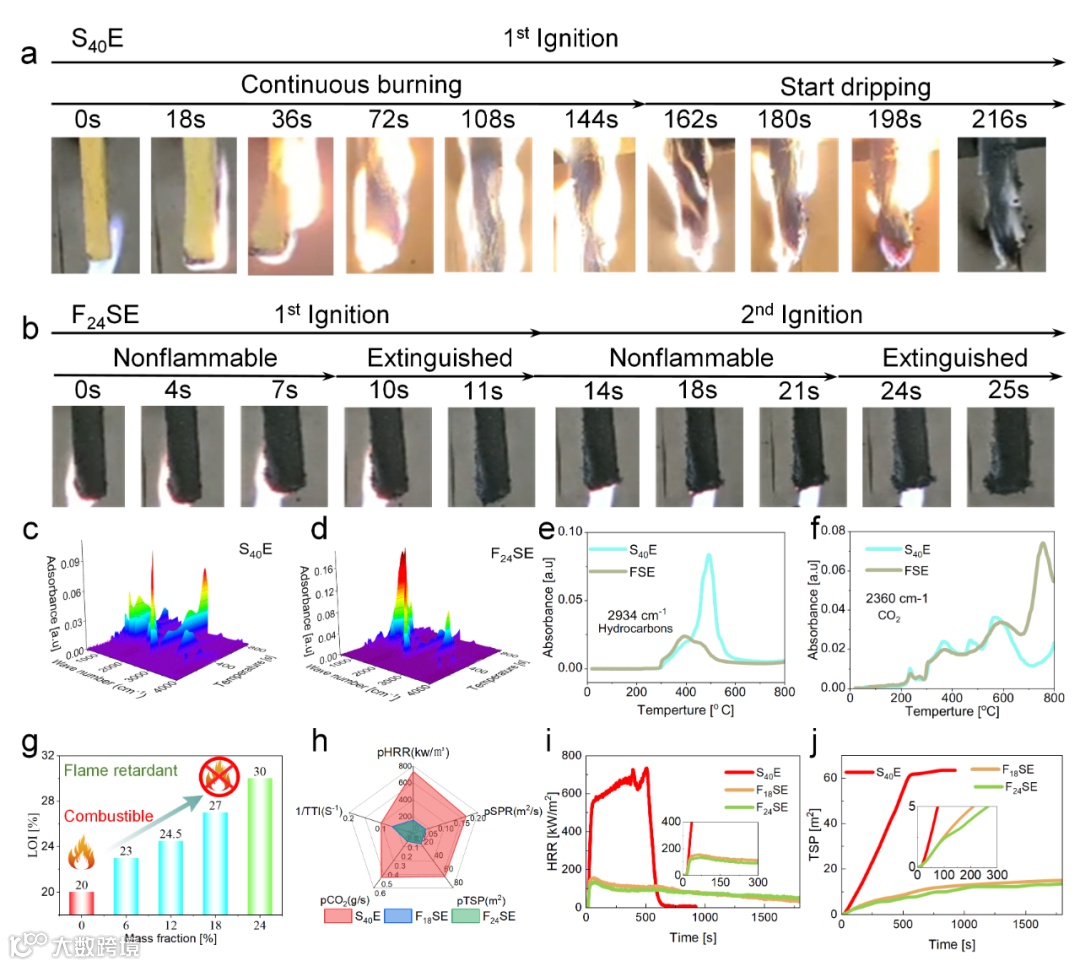 通常,大多数聚合物材料都是易燃的。因此,提高聚合物材料的阻燃性能对于其在高温和火焰环境下的应用具有重要意义。通过EG和APP的协同阻燃,复合海绵的阻燃等级达到了V-0级别。相比于未加阻燃剂的纯海绵,其可燃气体和有害气体的释放量都大幅下降,证明其在高温环境下的安全性。