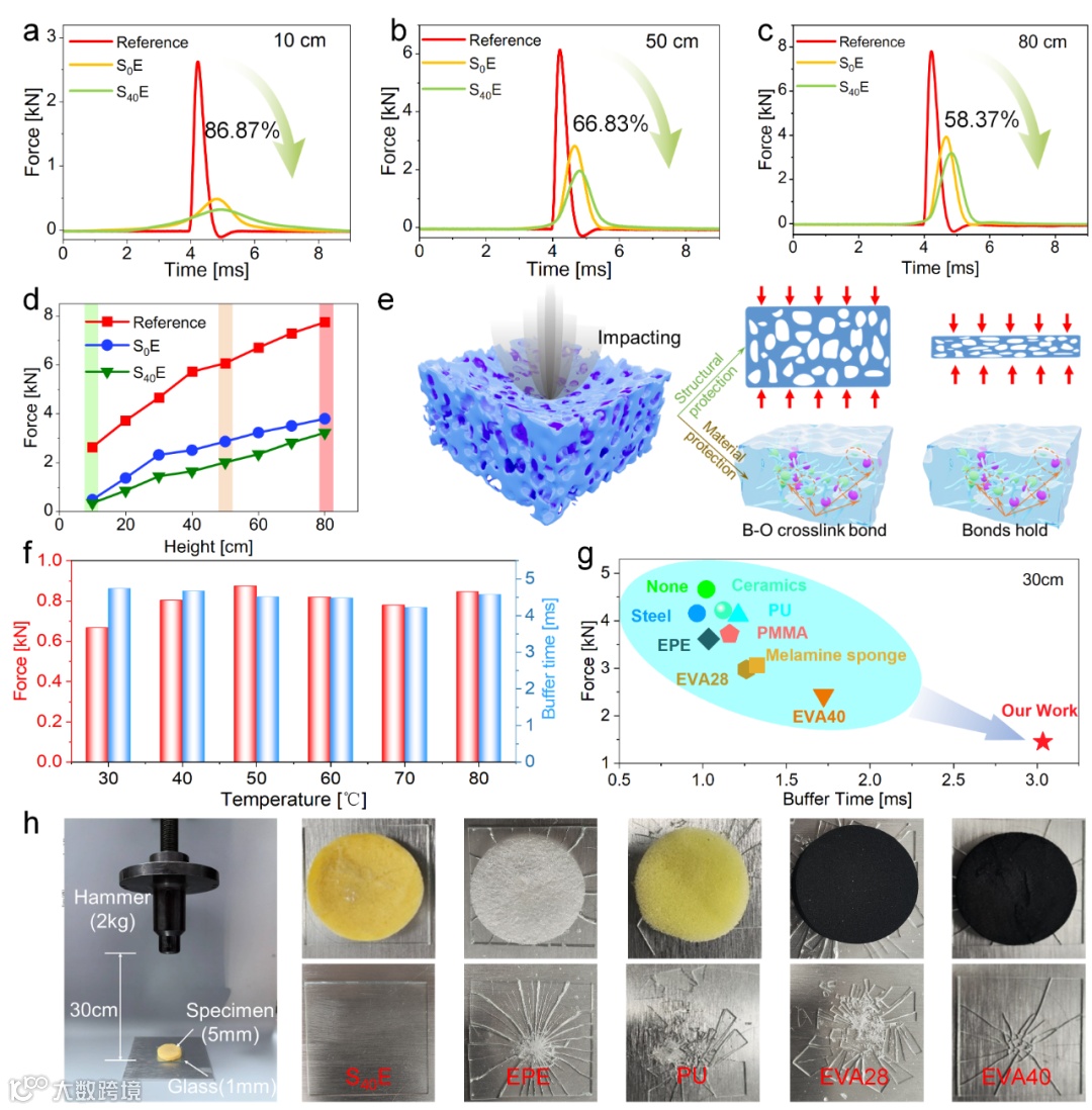 由于剪切变硬材料的引入和多孔骨架的存在,复合海绵材料在缓冲方面表现出色,且在30-80℃范围内抗冲击力学性能稳定。相比于其他工程材料,相同冲击条件下复合海绵表现出优越的缓冲效果和较低的冲击力峰值。