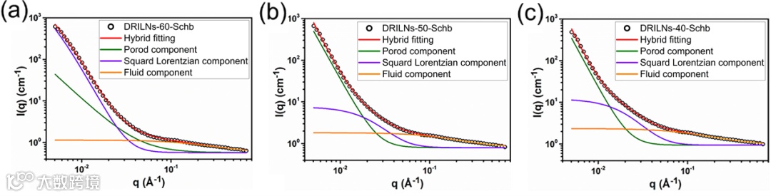 图4. (a) DRILNs-60-DA, (b) DRILNs-50-DA 和 (c) DRILNs-40-DA溶胀在90:10 (v/v)的THF/THF-d8混合溶剂中的散射谱图。混合模型用于拟合散射谱图,并从拟合结果中获得相应的三个组分:Porod 组分、平方洛伦兹组分和流体组分。DRILNs-x-DA代表DRILN-x中DSN-DA 的结构信息被突出显示。