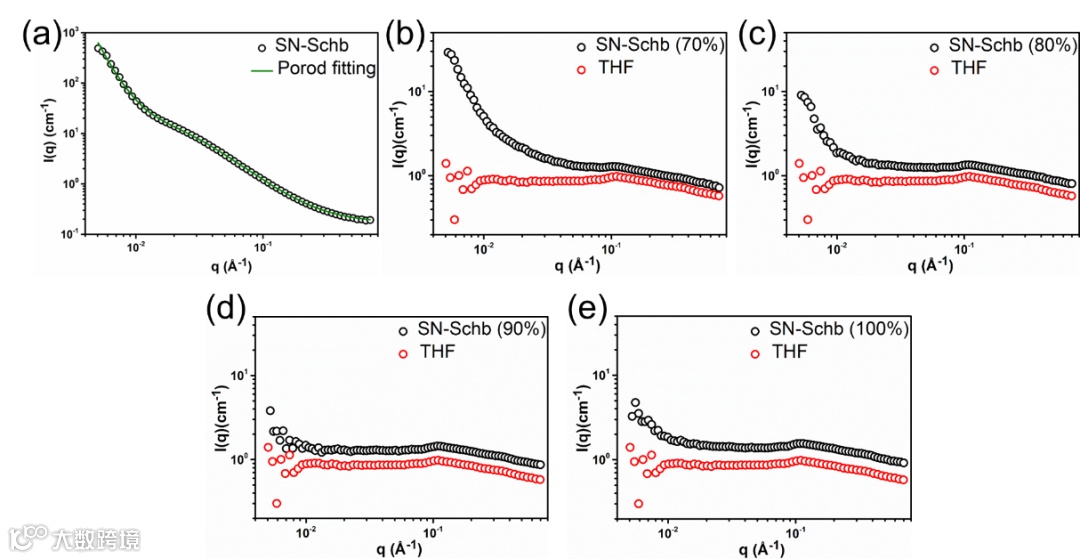 图3. (a) SN-Schb溶胀在纯THF-d8中的散射谱图,并用经典Porod模型拟合。(b~e) SN-Schb溶胀在THF/THF-d8混合溶剂中的散射谱图,并用经典Porod模型拟合。图中SN-Schb 后括号中的百分数代表了在THF/THF-d8混合溶剂中THF的体积百分数。