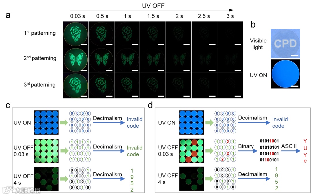 该NSPs材料具有良好的机械性能、独特的光活化室温磷光(RTP)和出色的溶剂稳定性。NSPs在几次回收后仍可以保持原有的机械性能和光活化的RTP性质。该工作展示了NSPs在高级信息安全中的概念验证应用。将有机分子掺入NSPs中,NSPs可以实现具有多种颜色的光活化RTP。由于NSPs的RTP寿命和发射颜色可调,NSPs显示了循环信息写入/擦除能力和具有时间分辨和时间-颜色分辨方式的加密和解密过程的高级信息加密系统(图2)。这项工作的结果为由CPDs组装的功能性新材料提供了一种有效的方案,并将推动未来可持续应用的创新纳米材料的开发。