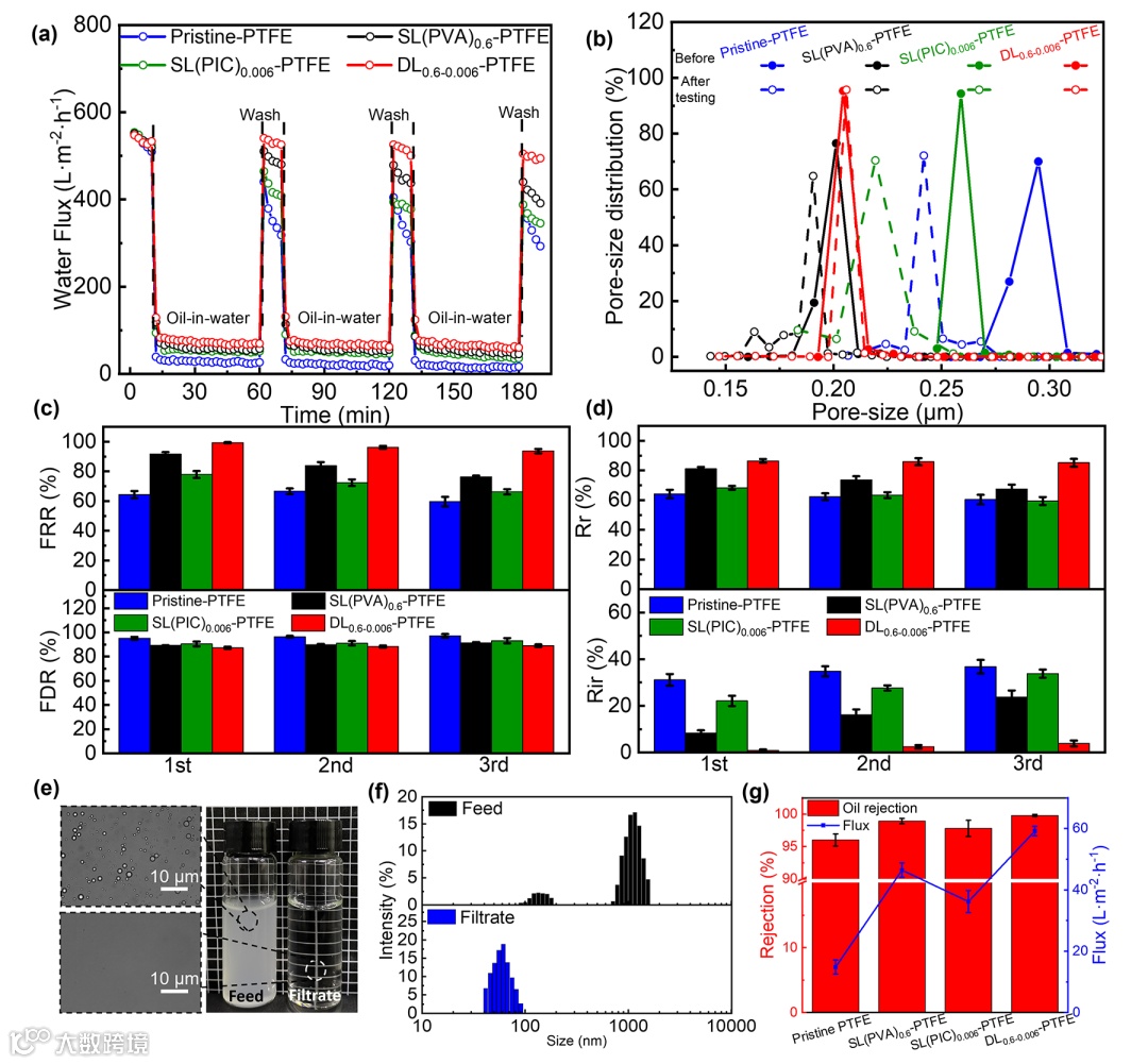 在所有样本中DL-PTFE膜在水与水包油乳液的三次循环过滤测试中表现出最高的通量(图3a)与最小的孔径变化(图3b),其拥有最优的通量回复率(FRR)、通量衰减率(FDR)(图3c)及通量回复率(FRR)、通量衰减率(FDR)(图3d),乳白色的水包油乳液经过DL-PTFE膜过滤后得到澄清透明的滤液(图3e),油滴被完全拦截(图3f),展现出最高的截油率(图3g),这是由于水凝胶改性层中存在大量亲水基团,促进了膜表面致密水合层的构建,大幅降低了油滴黏附产生污染的概率。
