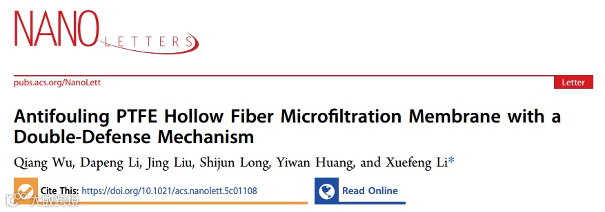 相关研究成果以“Antifouling PTFE Hollow Fiber Microfiltration Membrane with a Double-Defense Mechanism”为题发表在国际学术期刊《Nano Letters》上。论文第一作者为湖北工业大学25届硕士毕业生吴强,通讯作者为李学锋教授,第一单位为湖北工业大学,合作单位有美国马萨诸塞大学达特茅斯分校。