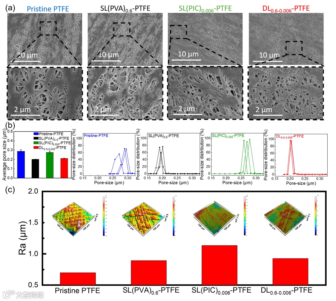 图2 DL-PTFE中空纤维膜的(a)SEM图像、(b)孔径分布以及平均孔径和(c)表面形态分析