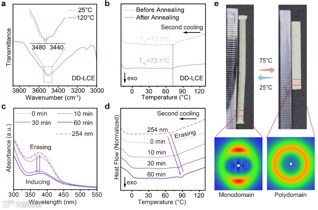 如图2所示,通过变温傅里叶变换红外光谱证实,氢键超分子相互作用在120 ℃时可被破坏,但差示扫描量热法(DSC)显示退火后的氢键网络重排对TNI影响甚微;紫外可见光谱分析证实[4+4]光环加成反应逐步发生;而254 nm紫外照射可实现几乎完全解聚恢复。DSC测试进一步显示,随着365 nm光照时间延长(0-60分钟),DD-LCE的TNI从72.8℃线性升至89.2 ℃,经254 nm光擦除后约恢复至初始值,表明光诱导拓扑转变通过调控交联密度可逆地改变TNI。SAXS证实单畴DD-LCE在加热至75 ℃以上时会发生单轴收缩,液晶元取向无序化,冷却后重新恢复单畴排列。这些结果共同揭示了氢键解离与蒽基二聚化对材料热力学性能的差异化调控机制。