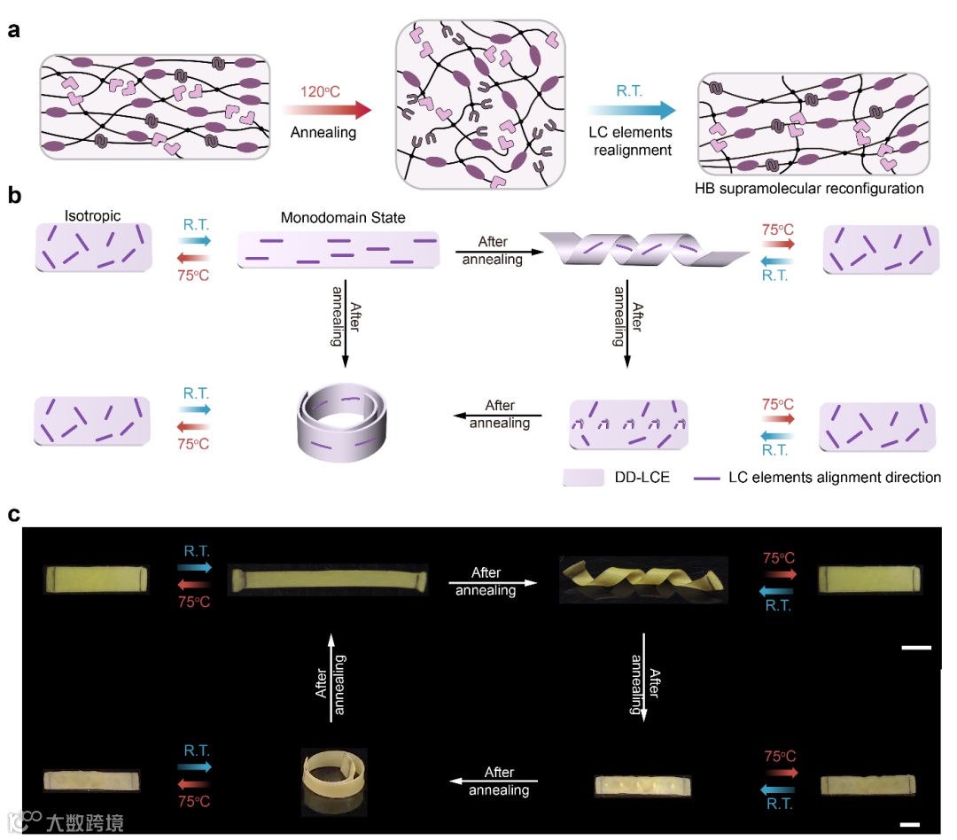 图5. DD-LCE的退火处理使氢键连接点断开从而实现液晶元的重新定向。