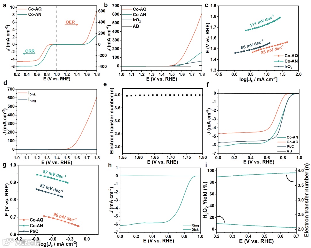 Co-AQ表现出卓越的OER性能。Co-AQ在电流密度为10 mA cm-2和50 mA cm-2时的过电位分别为280 mV和340 mV,远低于Cu-AQ、Ni-AQ和IrO2,并且塔菲尔斜率为83 mV dec-1,低于IrO2的86 mV dec-1。在稳定性测试中,Co-AQ在10 mA cm-2的恒定过电位下,经过100小时其电流保持率仍高达89.1%。同时Co-AQ还表现出良好的ORR性能,极限电流密度为4.67 mA cm-2。