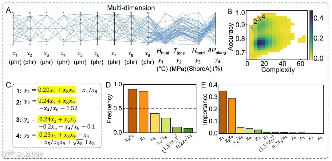 使用试错法优化橡胶复合材料的配方需要经历一个由实验、观察、分析和调整构成的迭代循环(图1A)。在这个循环中,每次仅改变一个变量,这个变量可以是某一组分的含量,也可以是一个加工参数。尽管这种方法效率低下,但它能够提炼出将性能与变量相关联的经验原理。为了提升试错法的效率,中国科学院长春应用化学研究所研究团队开发了一种名为“机器学习增强试错法”的创新方法,这种方法通过将正交实验设计与符号回归算法相结合,将试错法一次变一个变量改为一次变多个变量,利用符号回归提取若干变量同时变化时性能与变量之间的数学关系(图1B)。