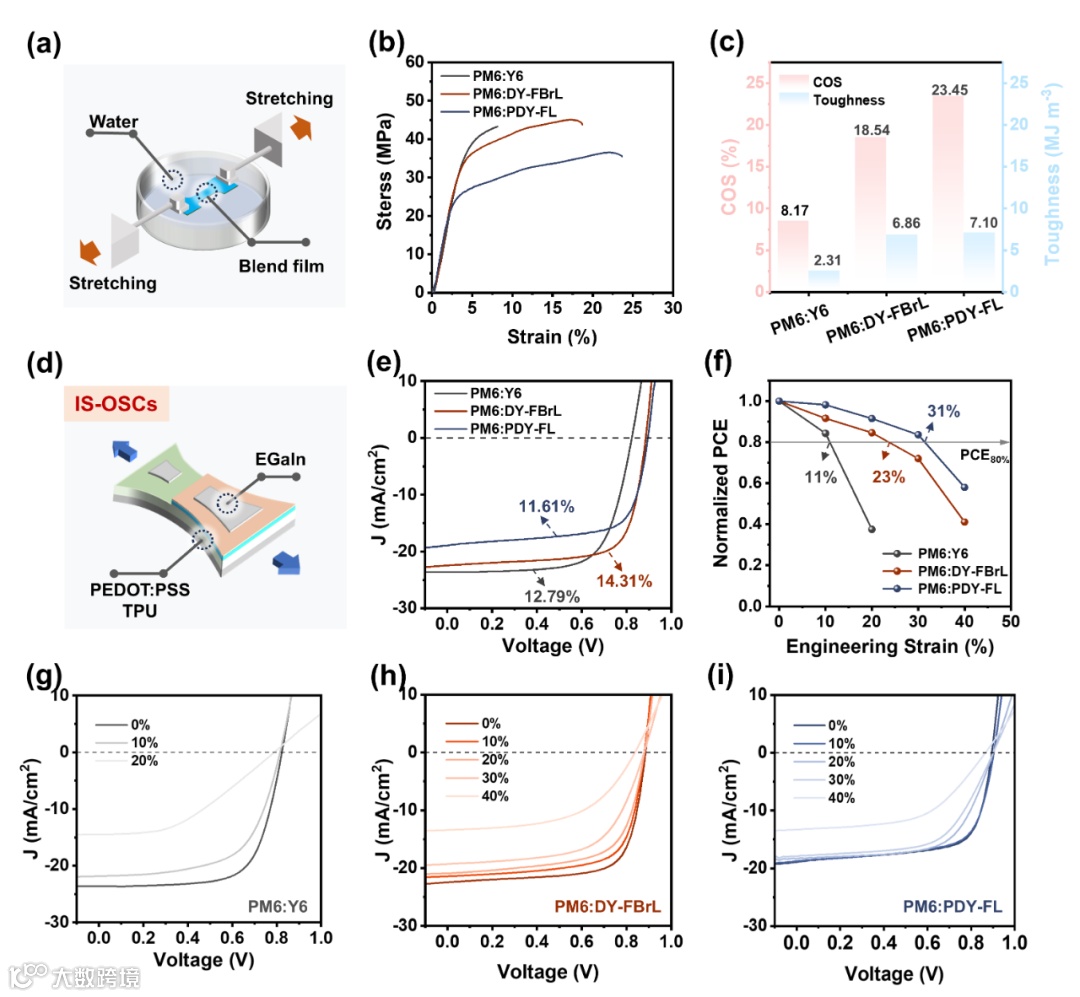 器件性能突破:为了验证这些新型柔性连接电子受体在可穿戴器件中的应用潜力,研究团队分别制备了基于DY-FBrL和PDY-FL的可拉伸器件。结果显示,基于DY-FBrL和PDY-FL的IS-OSCs的初始PCEs分别为14.31%和11.61%,同时其可拉伸性显著优于基于小分子受体的IS-OSCs。具体而言,Y6基器件的80%PCE保留率对应拉伸应变为11%,而基于DY-FBrL和PDY-FL的器件分别提升至23%和31%,展现了卓越的机械拉伸性能。