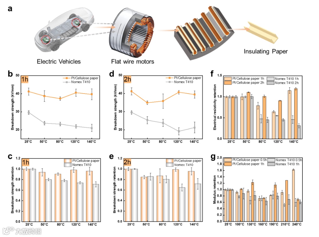 图 5. PI/纤维素纸的电绝缘性能。(a) PI/纤维素纸作为电动汽车电机绝缘材料的潜在应用。(b) PI/纤维素纸和 Nomex T410 在不同温度下热处理 1 h 后的击穿强度。(c) 在不同温度下热处理 1 h 后 PI/纤维素纸和 Nomex T410 的击穿强度保持率。(d) 在不同温度下热处理 2 小时后,PI/纤维素纸和 Nomex T410 中的分解强度和 (e) 保留率。(f) PI/纤维素纸和 Nomex T410 在不同温度下热处理 1 小时和 2 小时后的电阻保持性。(g) PI/纤维素纸和 Nomex T410 在不同温度下热处理后的模量保持率。与 Nomex T410 相比,PI/纤维素纸表现出良好的电绝缘性能。