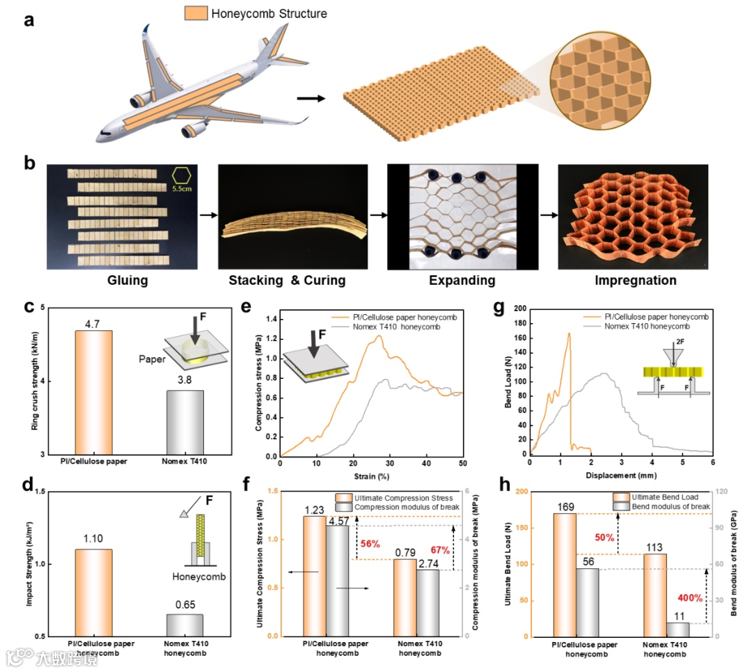 图 4. 用 PI/纤维素纸和 Nomex T410 制造的蜂窝结构部件的机械性能。(a) 蜂窝结构在飞机部件中的潜在应用说明。(b) 手工制作的 PI/纤维素纸蜂窝的实验室制造工艺。(c) 原纸的环压强度比较:PI/纤维素纸和 Nomex T410。(d) PI/纤维素纸蜂窝与 Nomex T410 蜂窝的冲击强度比较。(e) PI/纤维素纸蜂窝和 Nomex T410 蜂窝的压缩应力-应变曲线。(f) 两种蜂窝结构的极限压缩应力和压缩模量。(g) PI/纤维素纸和 Nomex T410 蜂窝的三点弯曲曲线。(h) 极限弯曲载荷和弯曲模量比较。与 Nomex T410 蜂窝相比,PI/纤维素纸蜂窝的机械性能显著增强。