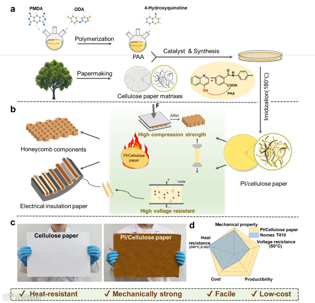 近期,华南理工大学制浆造纸工程国家重点实验室陶劲松课题组开发了一种简单且经济高效的方法,通过在纤维素纸中直接合成聚酰亚胺来生产高强耐热纸。通过使用聚酰亚胺(PI)作为替代耐热聚合物,通过低温化学亚胺化直接在纤维素纸中合成,该方法绕过了传统的芳纶纤维预合成,省去了其后续的纤维组装和造纸工艺,大大简化了生产复杂性并降低了成本(图1)。在该研究中同时评估了催化聚酰亚胺的催化剂和各种类型的纤维素纸张,确定了聚酰亚胺低温酰亚胺化的最佳催化剂和纸张结构(图2)。所得的 PI/纤维素纸表现出与商用芳纶纸相当的优异机械、热和介电性能(强度:89 MPa;最高工作温度:240 ℃;介电损耗:0.017 ∼ 0.004@1 ∼ 10⁶ Hz),以及出色的阻燃性、疏水性和防潮性(图3)。此外,用这种纸制造的轻质蜂窝结构组件优于用 Nomex T410 制造的组件(图4)。电绝缘纸的绝缘性能超过了 Nomex T410(图5)。特别是该方法简单、可扩展且具有成本效益,与Nomex T410,生产成本显著降低了约26.9%。(图6)这种方法具有相当或卓越的性能,再加上简化的制造工艺和较低的成本,为大规模生产坚固的耐热纸材料提供了一条有前途的途径,并拓宽了其在军事和民用领域的应用。