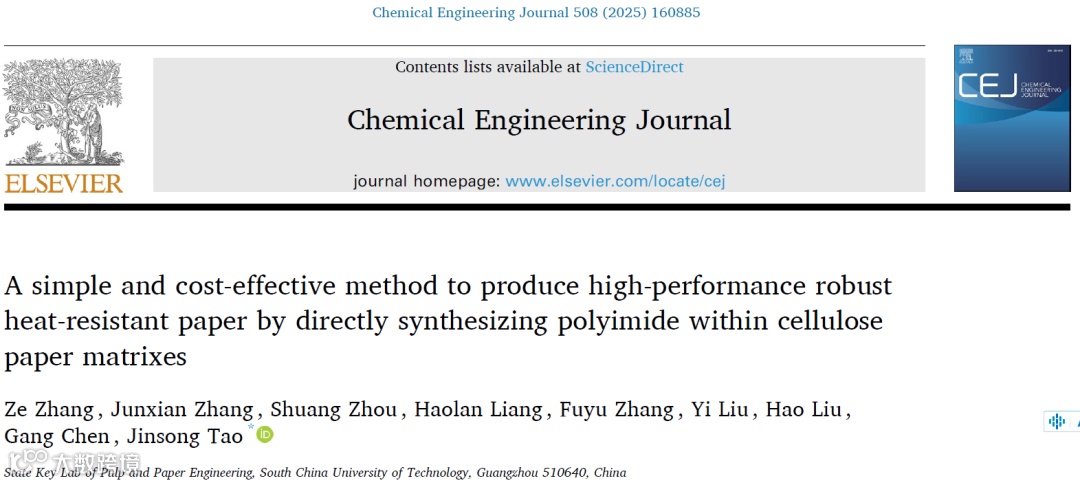 总结:该工作已经成功开发了一种简单且经济高效的方法,通过在纤维素纸中直接合成 PI 来生产高强耐热绝缘PI/纤维素纸。该方法不仅简单且可扩展,而且成本效益高,为大规模生产高性能耐热纸提供了一条有前途的途径。该工作以“A simple and cost-effective method to produce high-performance robust heat-resistant paper by directly synthesizing polyimide within cellulose paper matrixes”为题发表在《Chemical Engineering Journa》上(Chem. Eng. J. 2025, 508, 160885)。该研究由课题组硕士生张泽完成,得到广东省基础与应用基础研究基金的支持。