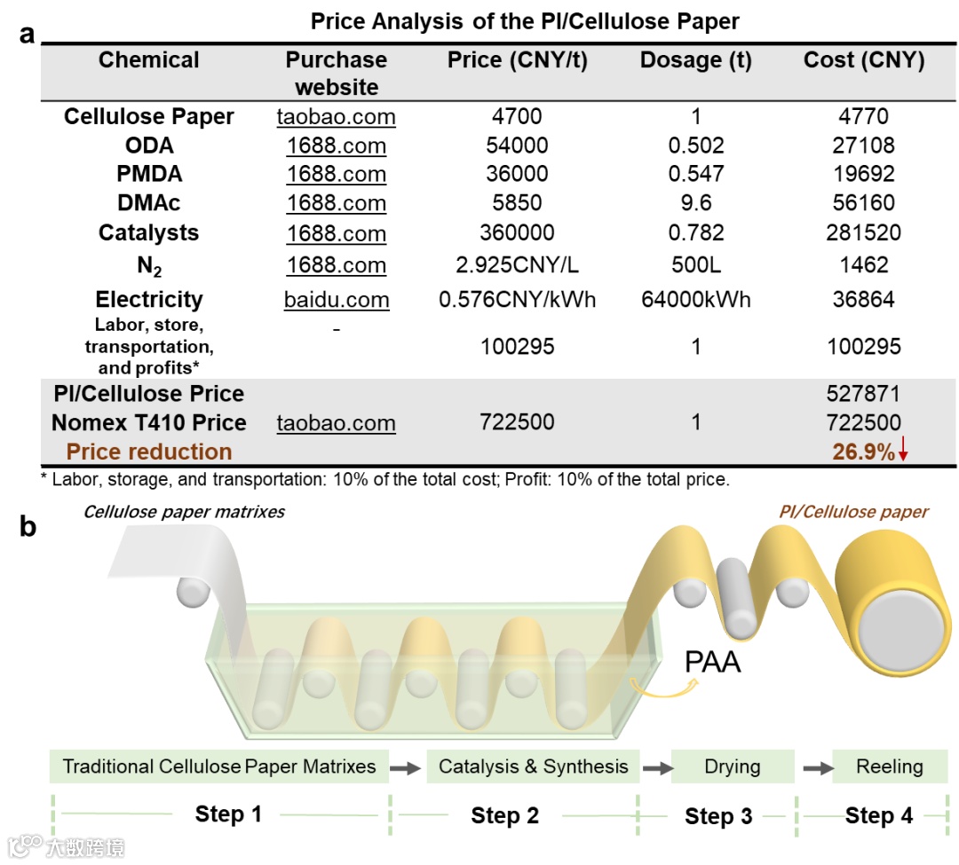 图 6. PI/纤维素纸的生产成本分析和可大规模生成潜在分析。(a) PI/纤维素纸和 Nomex T410 的生产成本比较,表明 PI/纤维素纸的成本比 Nomex T410 低约 26.9%。(b) PI/纤维素纸潜在大规模生产过程的示意图,突出其简单性、兼容性和可扩展性。