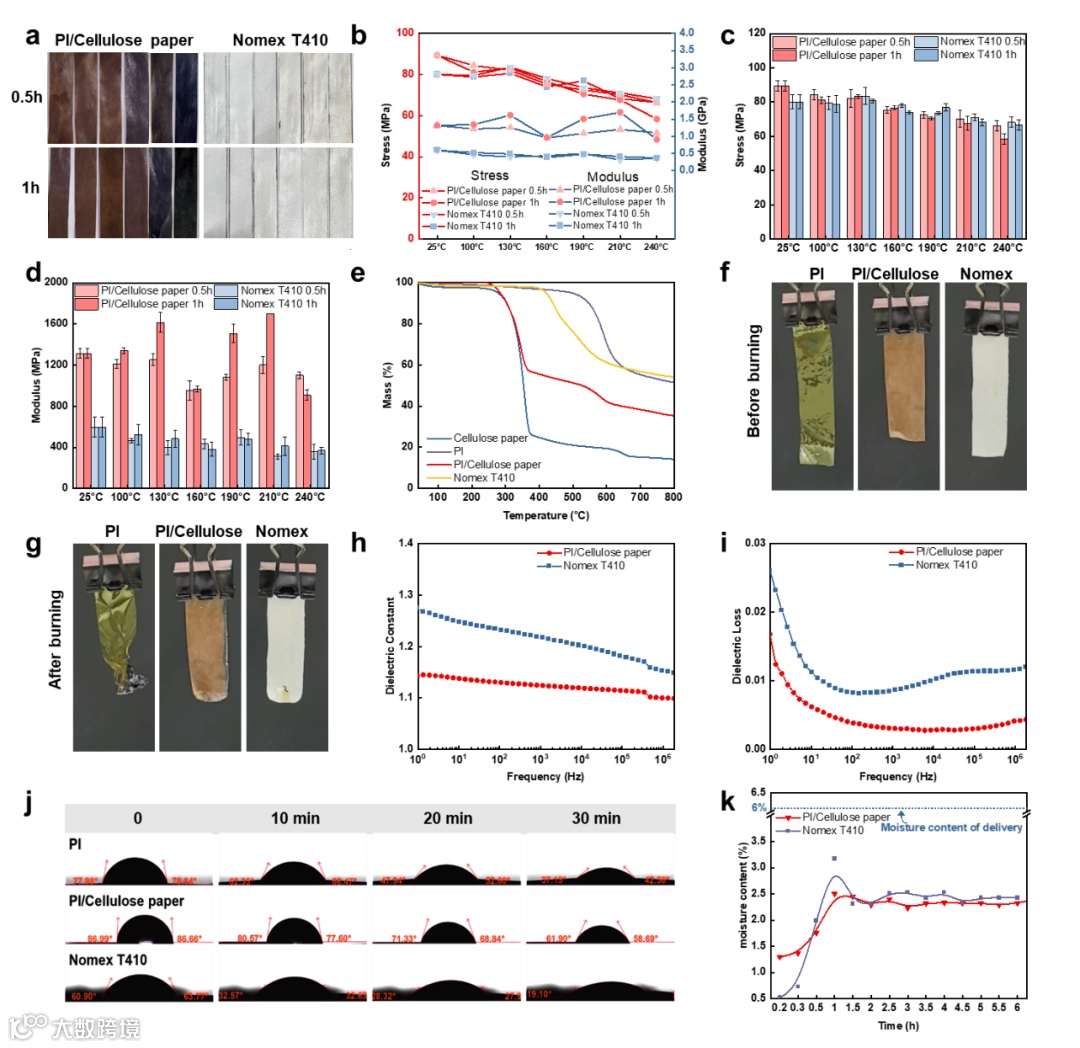 图 3. PI/纤维素纸的耐热性、介电性能和润湿性。(a) 热处理 (100、130、160、190、210 和 240 ℃ 0.5 和 1 h) 后 PI/纤维素纸的数字图像,显示其优异的热稳定性。(b) PI/纤维素纸和 Nomex T410 的应力和模量随温度的变化。(c) 热处理后 PI/纤维素纸和 Nomex T410 的应力降解。(d) 热处理后 PI/纤维素纸和 Nomex T410 的模量降解。(e) 原始纤维素纸、PI 膜、PI/纤维素纸和 Nomex T410 的热重 (TG) 曲线。(f) 及 (g) 阻燃性测试。(h)-(i)PI/纤维素纸和 Nomex T410 的介电常数和损耗。(j) PI 膜、PI/纤维素纸和 Nomex T410 的水接触角的数字图像。(k) PI/纤维素纸和 Nomex T410 的吸湿性。