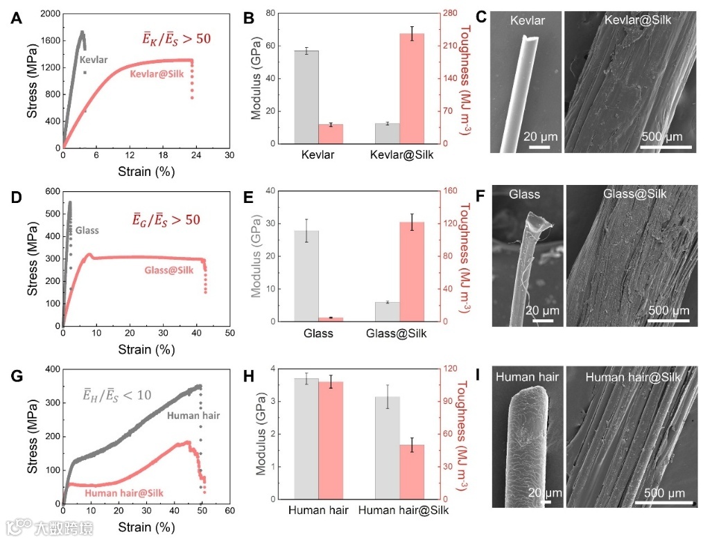 利用“拉伸-剪切”模型,研究了复合纤维中两相的协同机制,即竹纤维主要承担拉伸载荷,而丝素蛋白通过粘弹性变形和界面滑移耗散能量。模型计算与实验数据高度吻合,证实丝素蛋白的模量(550 MPa)与竹纤维(30-40 GPa)相差50-70倍时,界面能量耗散效率最优。该技术的突破性在于其广泛适用性,研究团队进一步将该界面工程策略应用于Kevlar和玻璃纤维。实验显示,Kevlar@丝素复合纤维的韧性从41 MJ m⁻³提升至236 MJ m⁻³,玻璃纤维@丝素复合纤维的韧性从20 MJ m⁻³增至120 MJ m⁻³。然而,当该策略应用于模量相近的天然毛发(与丝素蛋白模量之比小于10)时,增韧效果显著下降,印证了“刚柔并济”是该策略的前提条件。
