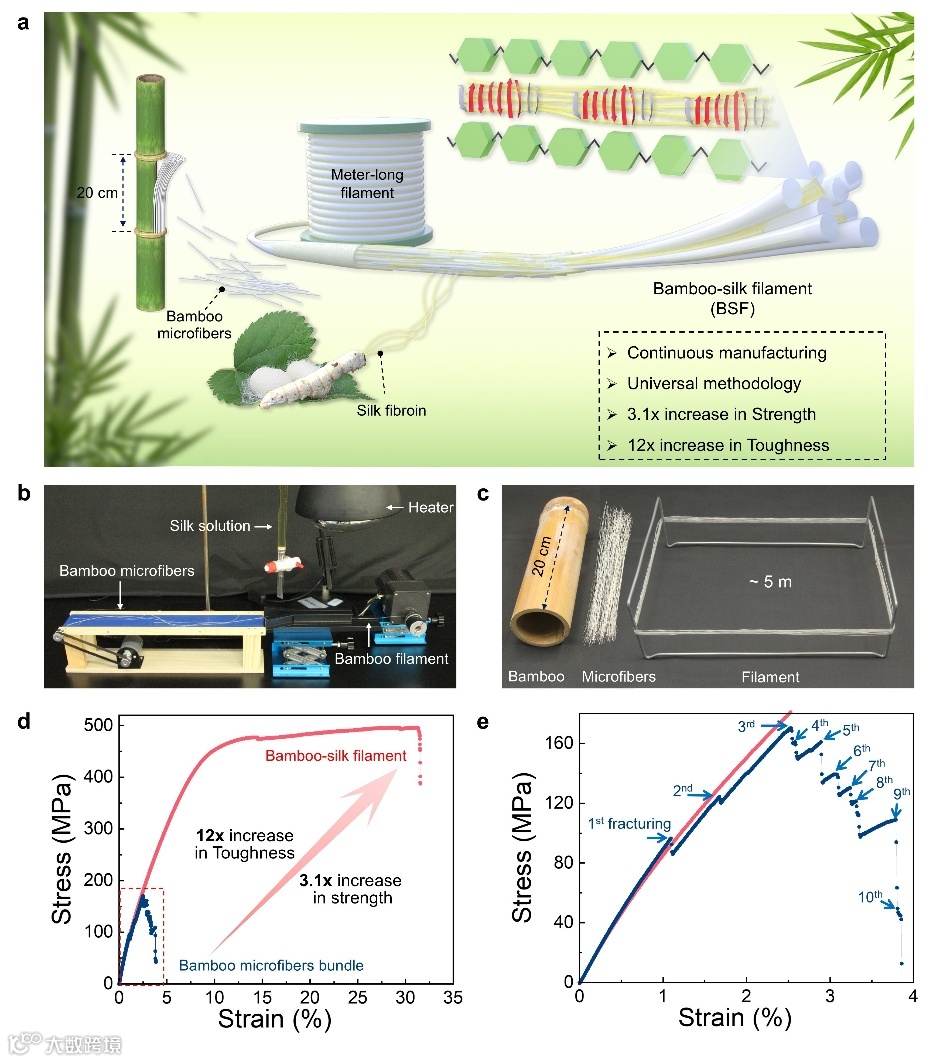 图1. 竹基-丝蛋白复合纤维的连续化制备及其力学性能