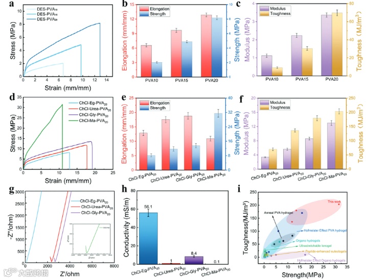 图2 深共晶凝胶的力学和电化学性质。a )应力-应变曲线,b )延伸率和强度,c )不同PVA浓度的ChCl - Eg - PVA深共晶凝胶的弹性模量和韧性。d )应力-应变曲线,e )延伸率和强度,f )不同DES处理的DES - PVA20深共晶凝胶的弹性模量和韧性。g )电化学阻抗谱( EIS )测量,h )不同DES处理的DES - PVA20深共晶凝胶的离子电导率。i )本工作与各种凝胶在断裂强度与韧性方面的比较。