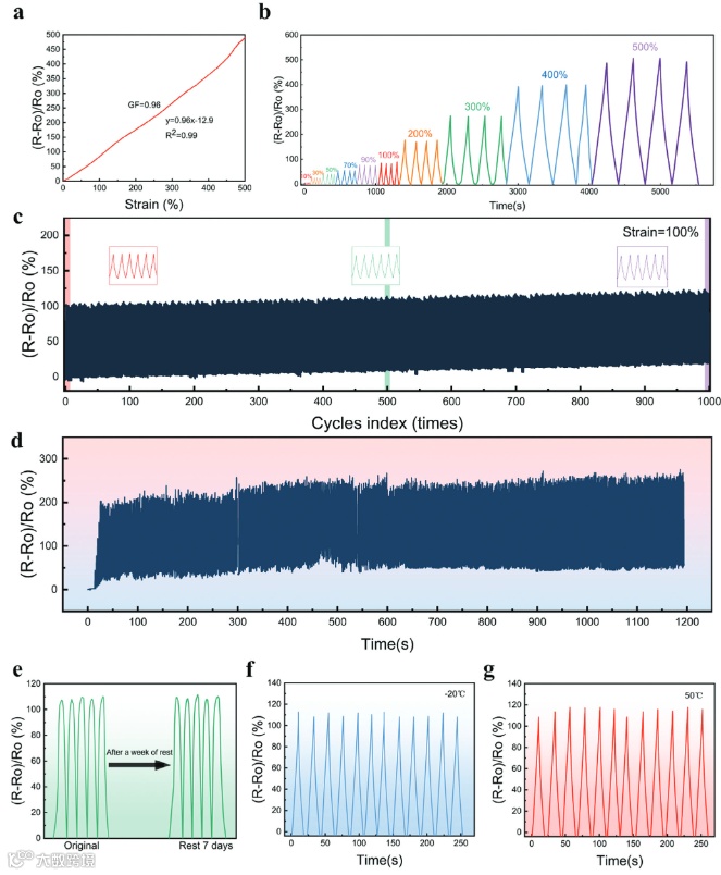 图4基于高强韧ChCl - Ma - PVA20深共晶凝胶的可穿戴传感器。a )在500 %应变范围下的电阻变化率-应变曲线和相应的GF值。b )在低应变( 0-90 % )和高应变( 100-500 % )下循环拉伸过程中的相对电阻变化。c ) ChCl - Ma - PVA20深共晶凝胶在100 %应变下进行1000次加载-卸载循环的相对电阻变化。d )志愿者穿着ChCl - Ma - PVA20深共晶凝胶传感器在20分钟内观察到的电阻变化。e )可穿戴传感器在极端温度下长时间储存或( f,g )暴露后的性能。