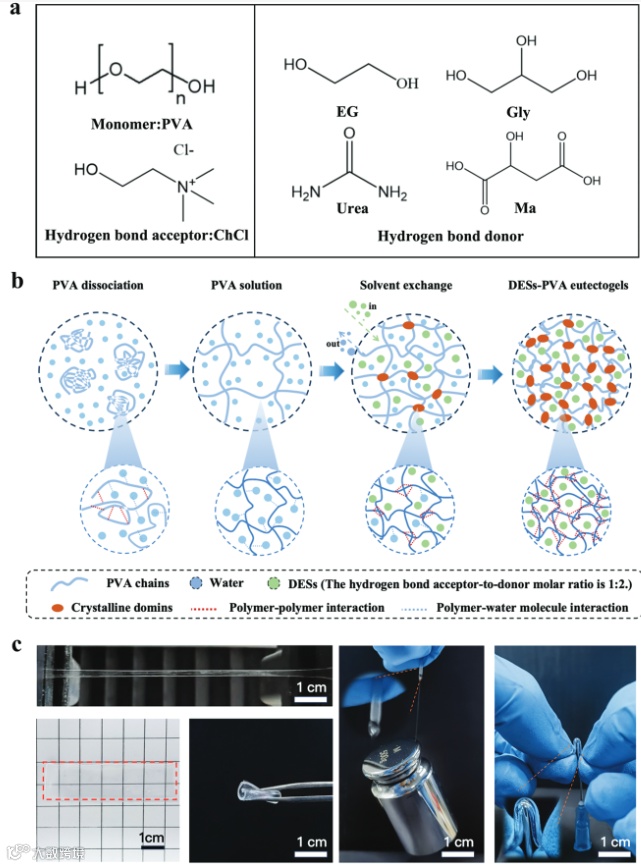 图1 高强度、高韧性深共晶凝胶的合成:a )聚合物PVA、氢键受体(ChCl)和4个氢键给体(乙二醇、甘油、尿素、苹果酸)的化学结构;b )浸泡辅助交联法制备高强度、高韧性共凝胶的示意图;c )具有高透明度、高强度、高韧性和耐穿刺性的深共晶凝胶。