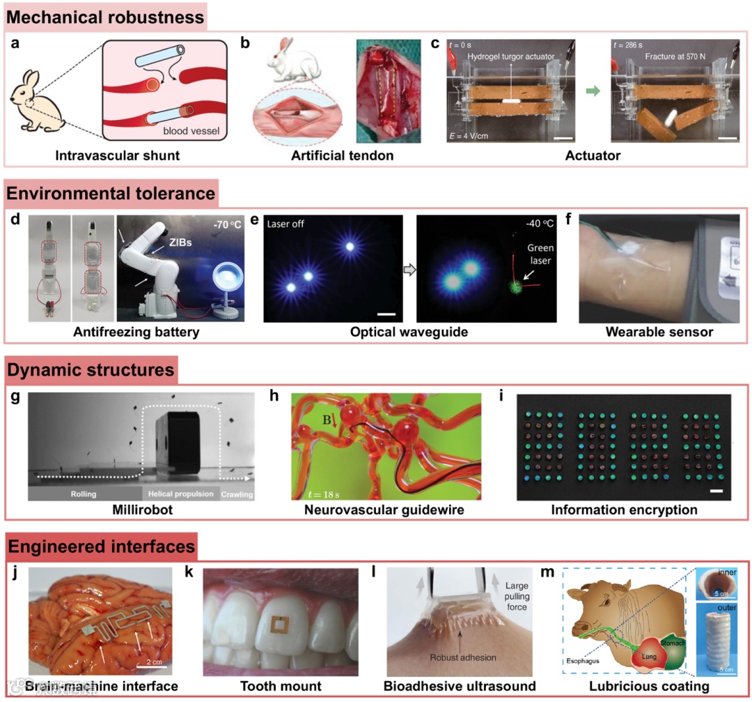 图5.自适应水凝胶在恶劣条件下的实际应用,按其关键功能分类:机械强韧性、环境耐受性、动态结构和工程化界面。