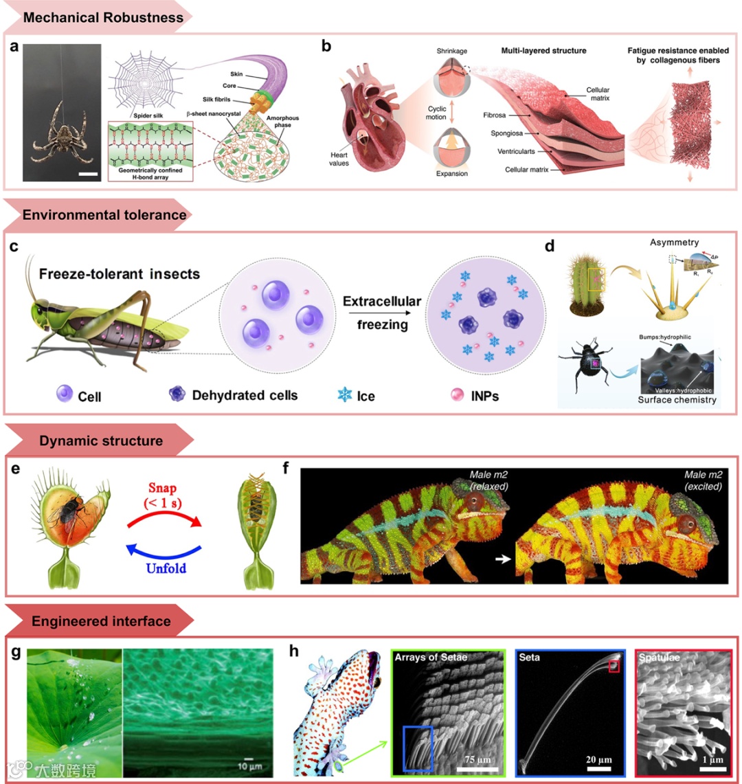 图2. 自然界在机械强韧性、环境耐受性、动态结构和工程化界面方面适应恶劣条件的智慧。