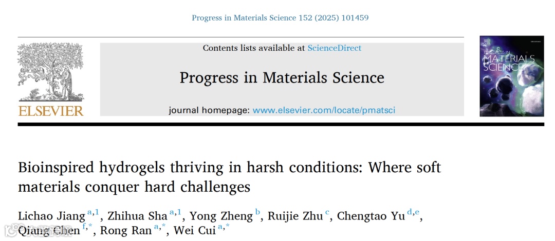 相关内容以“Bioinspired hydrogels thriving in harsh conditions: Where soft materials conquer hard challenges”发表于Progress in Materials Science,通讯作者分别为国科大温研院陈强研究员,四川大学冉蓉教授及崔为副研究员。