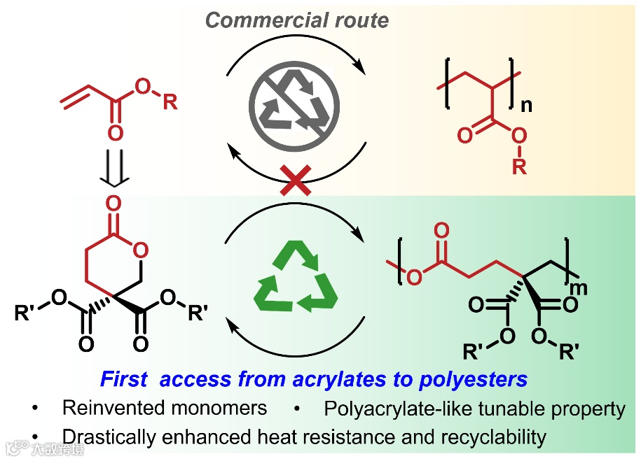 对于极性烯类单体,通过其双键连续聚合构建的高分子因低廉的成本与优异的性能成为了现代社会应用最广泛的合成材料之一;但其碳-碳主链的化学稳定性导致了材料难以降解,造成了严重的环境污染问题。丙烯酸酯作为最为重要的一类极性烯类单体,如何赋予其所合成高分子以降解性能甚至化学回收性能是近年学术界最为关注的研究热点之一。虽然学术界近期初步通过链端解聚、链中解聚等策略实现了聚甲基丙烯酸酯(PMMA)材料的降解,但是聚丙烯酸酯(PMA)因结构限制其解聚却仍相对困难,因此目前无论①利用丙烯酸酯构建可降解高分子还是②开发结构/性能类似于PMA并可降解、甚至可循环的绿色可持续材料均仍缺乏有效的手段。