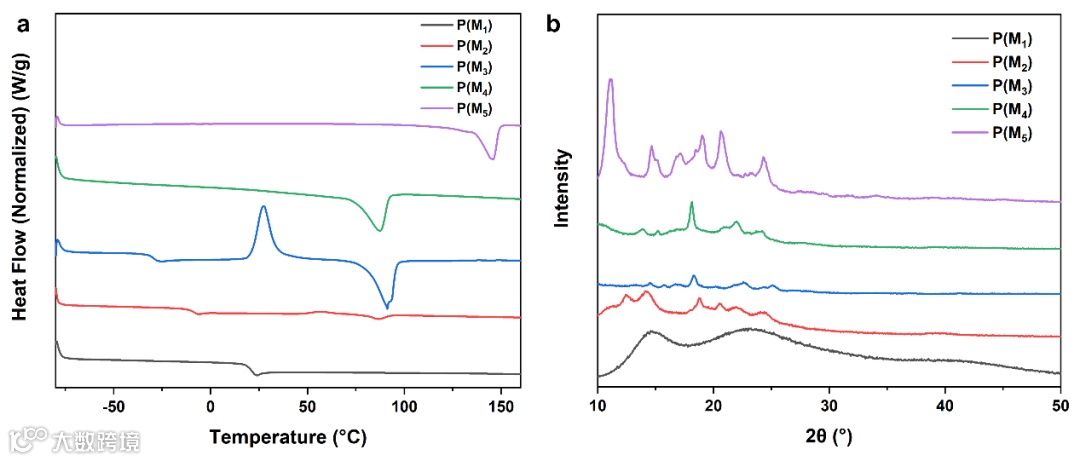 图4.系列聚合物的热学和结晶性能表征 (a) 差示扫描量热测试(DSC)测试结果 (b) X射线衍射(XRD)测试结果