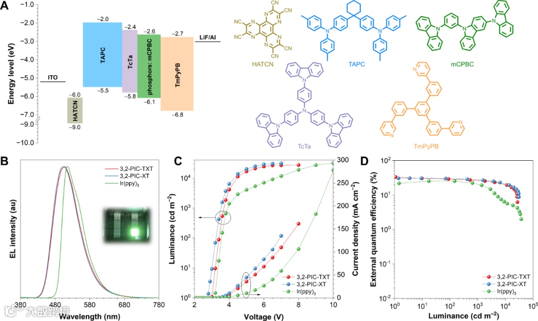 随后,作者以3,2-PIC-TXT、3,2-PIC-XT为发光客体制备了掺杂OLED器件,并与传统磷光材料Ir(ppy)3进行对比(图3)。基于3,2-PIC-TXT的掺杂OLED器件的电流效率(CE)、功率效率(PE)和外量子效率(EQE)峰值分别为92.2 cd A–1、96.6 lm W–1 和33.2%,效率滚降较小,性能优于3,2-PIC-XT(87.9 cd A–1、96.8 lm W–1和30.8%)及Ir(ppy)3(90.8 cd A–1、83.8 lm W–1和25.2%)。