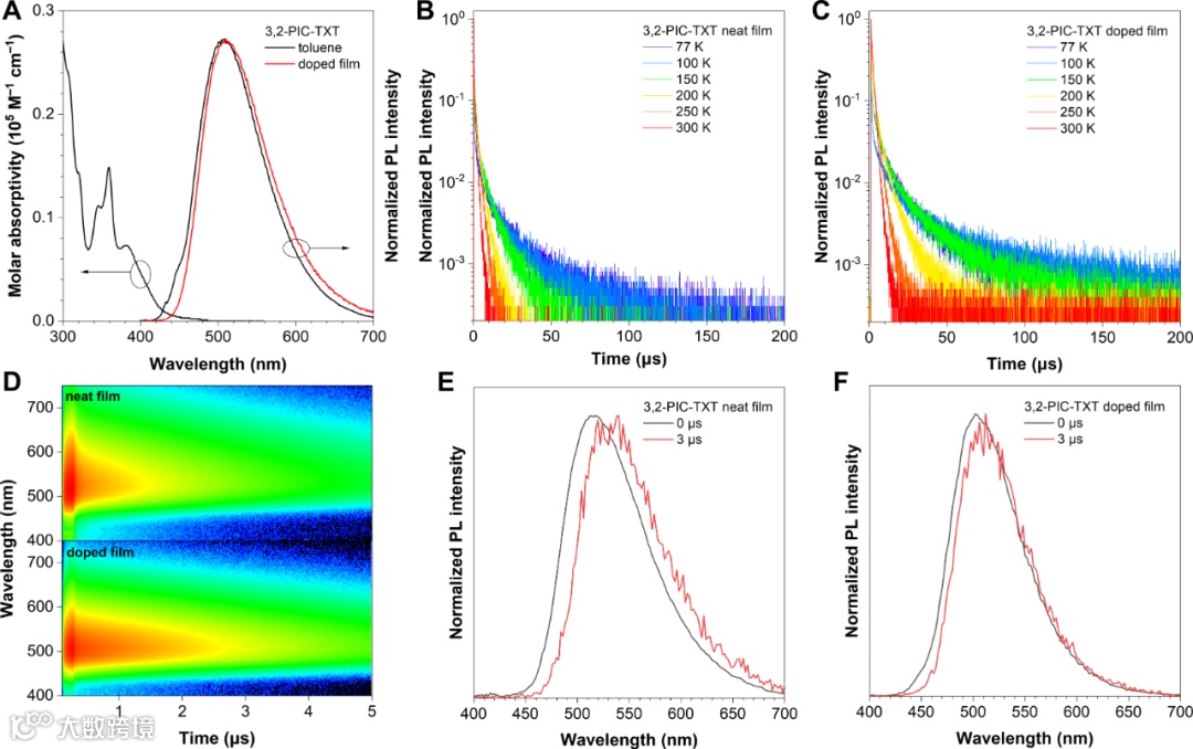 近日,华南理工大学赵祖金教授课题组开发了一种基于噻吨酮的高效RTP分子3,2-PIC-TXT(图1)。3,2-PIC-TXT的吸收峰位于380 nm,对应其分子内的电荷转移(CT)态吸收。在氮气环境下,3,2-PIC-TXT的光致发光峰位于513 nm。若在3,2-PIC-TXT的甲苯溶液中通入氧气,则其光谱会迅速减弱且蓝移,这与已报道的RTP分子3,2-PIC-XT类似。进一步通过测试不同温度下的发光寿命和室温下的时间分辨光谱,确定了3,2-PIC-TXT室温下磷光发射的特性(图2)。由于硫的重原子效应,3,2-PIC-TXT的磷光辐射跃迁速率(kphos = 6.8 × 105 s–1)、磷光成分占比(rphos= 98.3%)相比3,2-PIC-XT(kphos = 2.4 × 105 s–1,rphos = 64.6%)都有了显著提升。