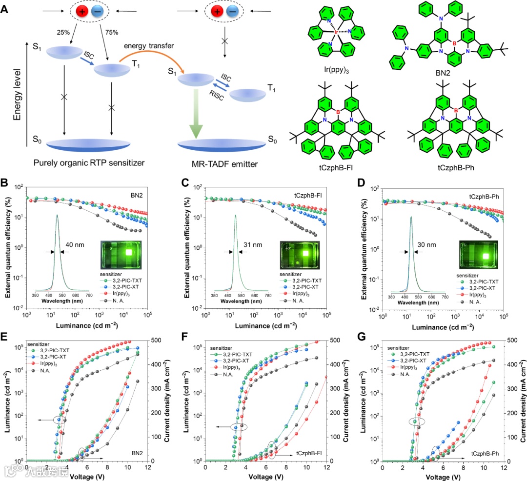 图4. 磷光敏化剂制备MR-TADF超荧光OLED器件的性能