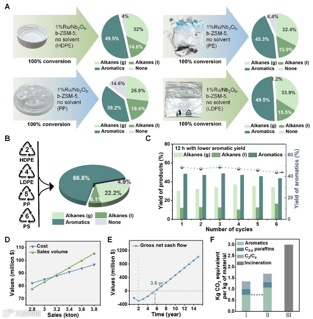 全球每年产生超过3.6亿吨塑料垃圾,其中约79%最终被填埋或流入自然界,不仅对土壤和海洋造成严重污染,还可能以微塑料的形式威胁人类健康。传统的塑料处理方式,如焚烧,不仅碳排放高,而且经济性效益低。尤其是最常见的聚烯烃塑料(如聚乙烯、聚丙烯),由于其高度稳定的化学结构,在热裂解或氢解后通常只能得到一系列碳链分布广泛的混合烷烃/烯烃,难以实现高附加值利用。