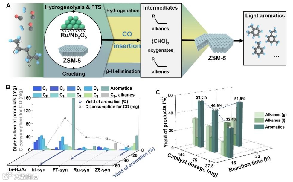 将废旧聚烯烃高效转化为轻芳烃(BTX)不仅能精准控制产物分布,还可大幅提高产品附加值,使产物重新进入芳烃循环,延长材料的生命周期。然而,传统芳构化工艺(如石脑油催化重整)通常需要高于500℃的高温,能耗高,还会导致聚烯烃不可控的自由基裂解。因此,开发一种低温高效的催化转化策略,打破聚烯烃的惰性化学键,实现选择性芳构化,成为塑料资源化利用的关键挑战。