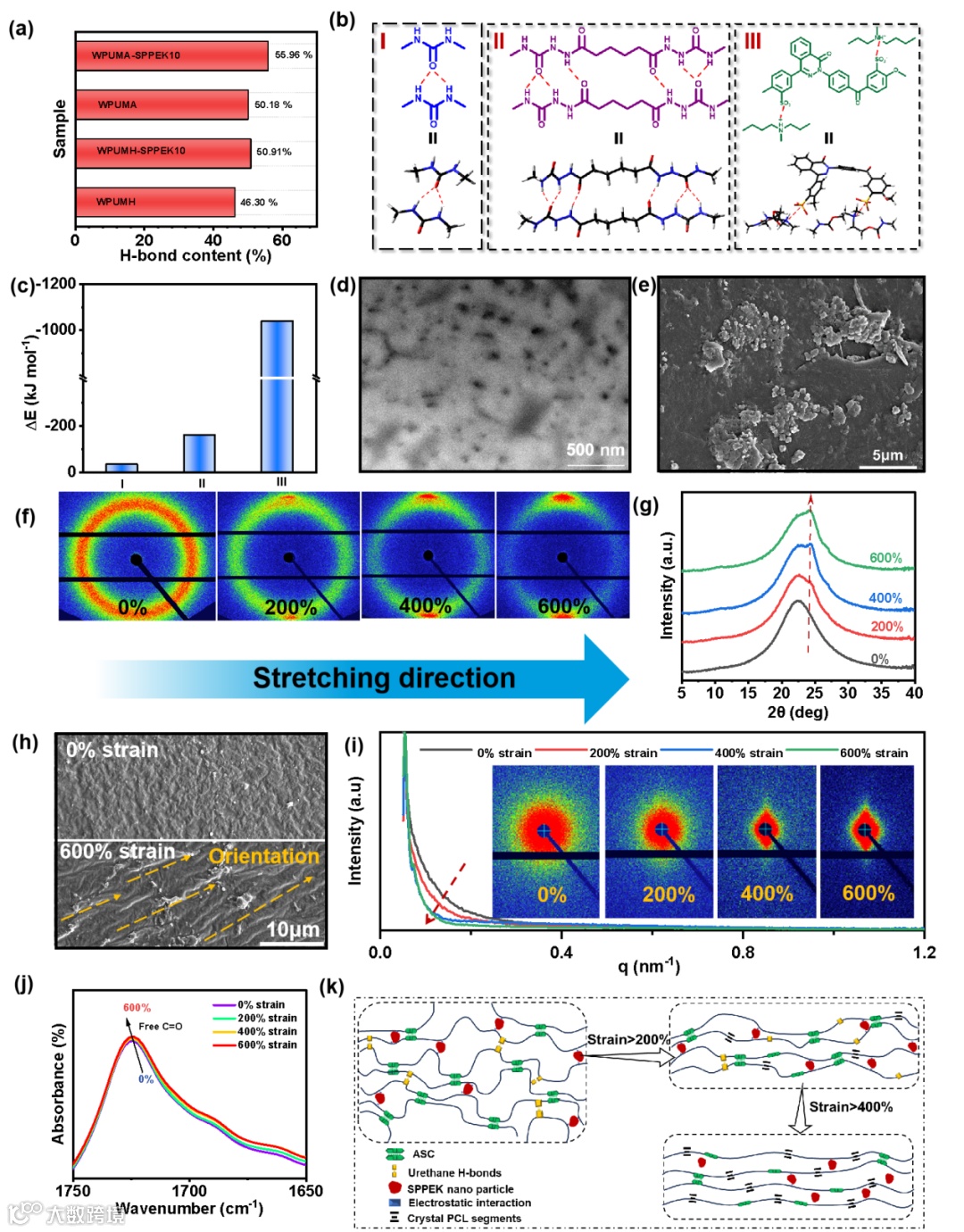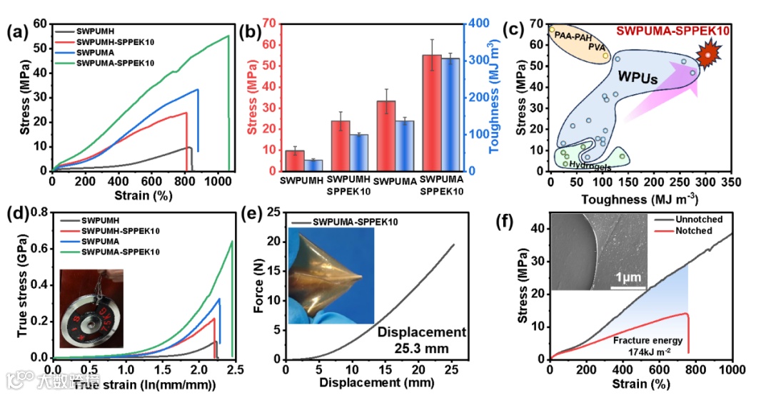 该材料是通过将本团队自主研发的磺化杂萘联苯聚芳醚酮(SPPEK)与含酰基氨基脲(ASC)的阳离子超分子水性聚氨酯(SWPUMA)在水溶液中复合,再经过离心和热压工艺制备而成。得益于ASC、静电相互作用与刚性SPPEK纳米粒子的协同效应,SWPUMA-SPPEK10展现出卓越的机械性能,其拉伸强度达55.19 MPa,韧性高达305.93 MJ/m³。其力学性能甚至超过了常见的商用水溶性聚合物(如PVP、PVA等)。聚合物链中丰富的动态超分子相互作用还赋予其优异的自修复性和可回收性。这种仿生结构设计为构建兼具高强度与可回收性的高性能水性聚合物提供了新的思路。