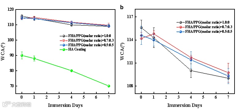图3.不同涂层在酸雨模拟液中浸泡后的水接触角变化(b图为a图的局部放大)。